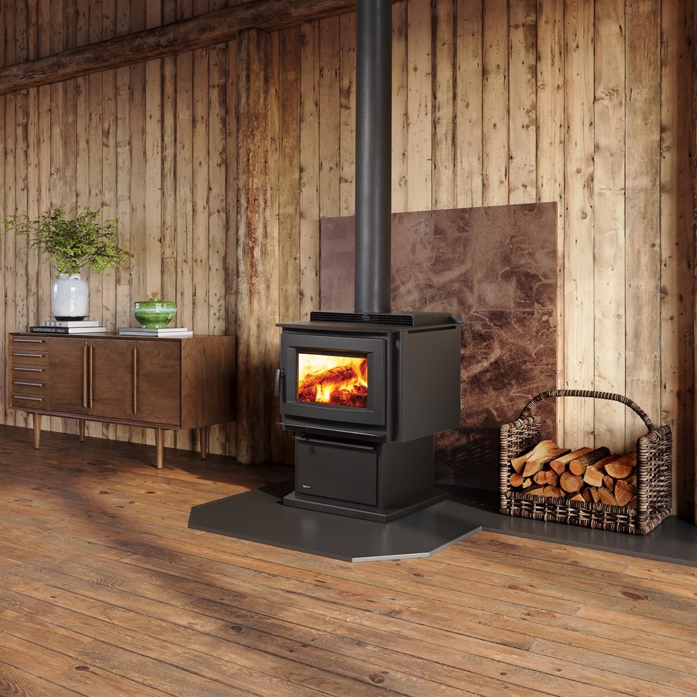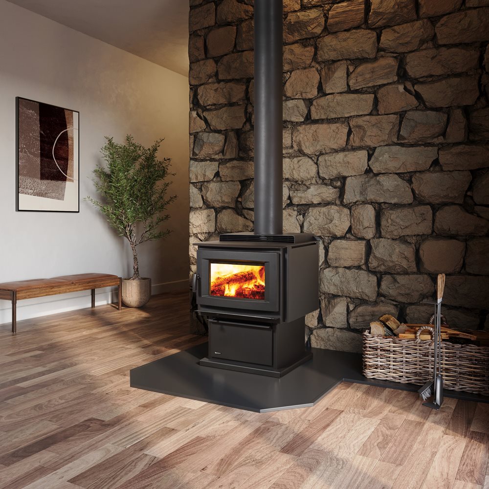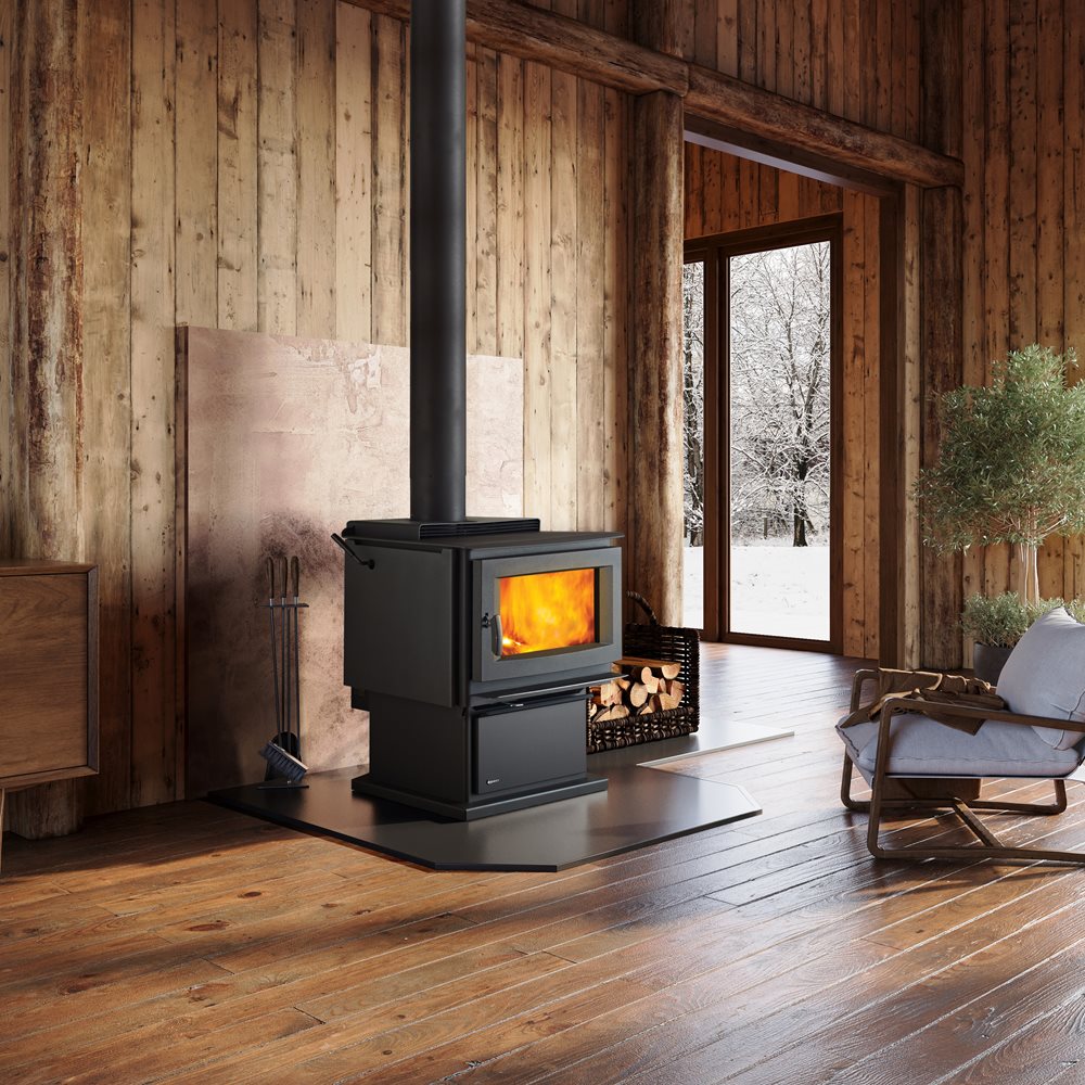 The F5200 wood stove lets you load an impressive 90 pounds of fuel. Its clean, classic design provides the perfect backdrop to the wide view cast door giving you a large fire view that will take your breath away!