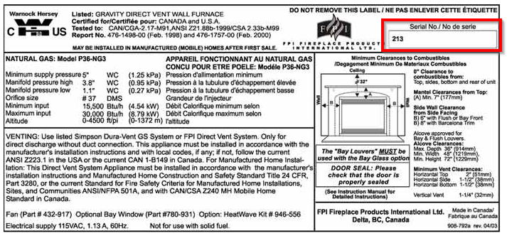 A rate plate is a mandatory label that is included in every wood or gas appliance, and it includes all relevant manufacturing, testing, certification, and compliance information. It looks like the image below and will include your Serial number & fireplace make/model.