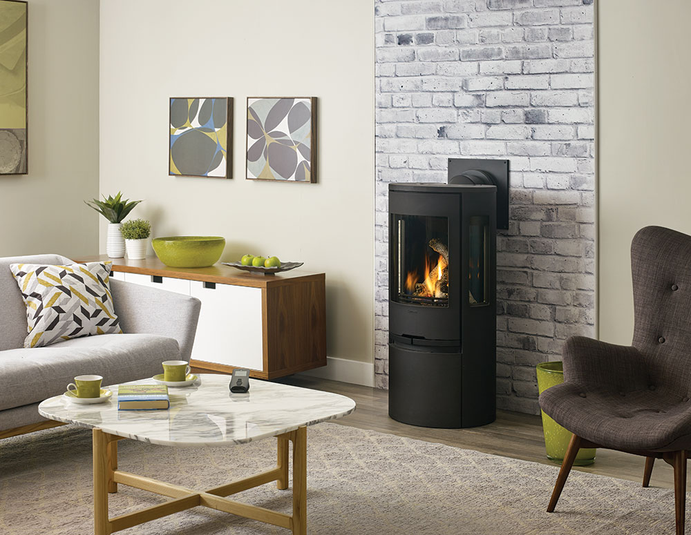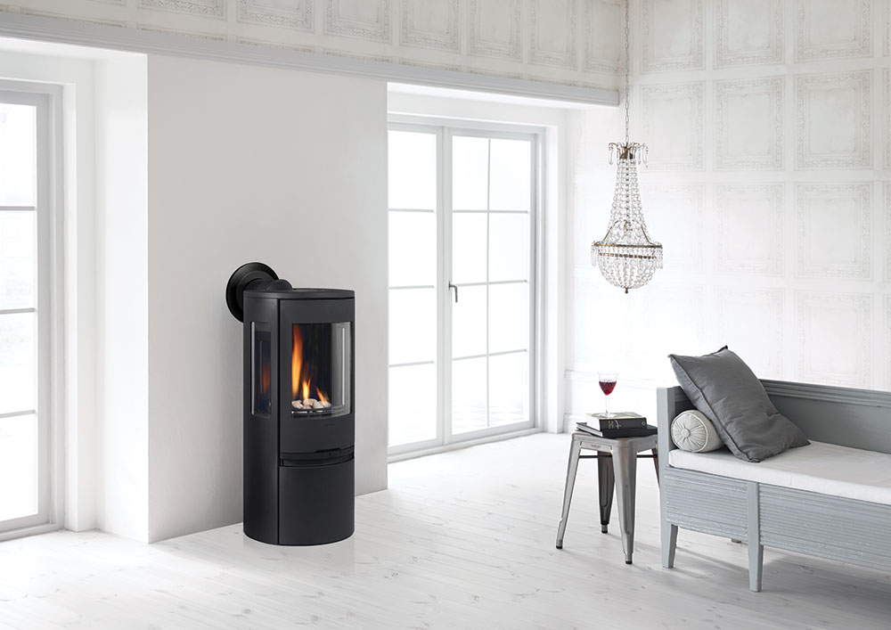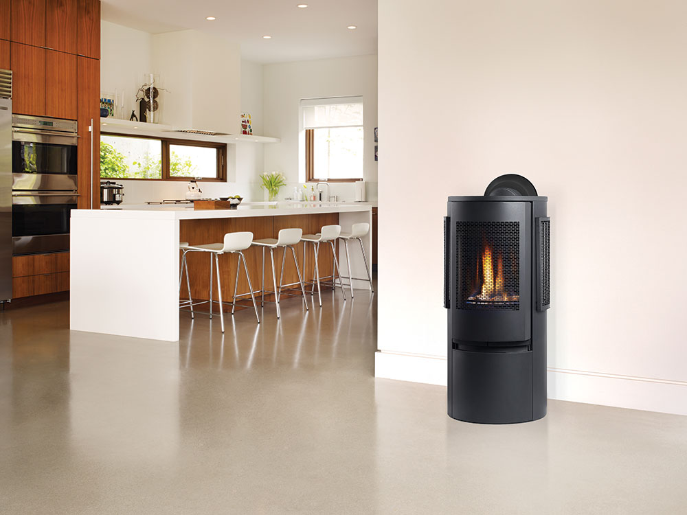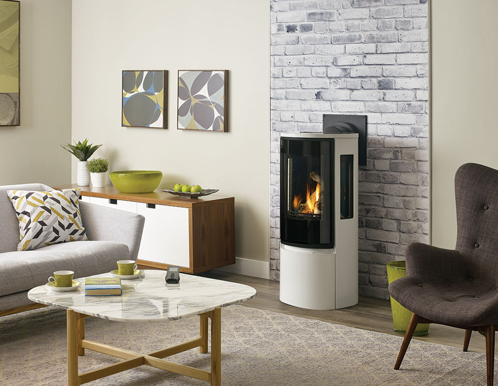 Regency Contura RC500E gives a light and modern impression to any home. There is no bad spot to sit when warming up in front of this unit. Available in black  or white, you can customize this modern gas stove with a traditional log set or ultra-modern shimmering crystals. The curved design invites you to enjoy a stunning flame view from three sides.